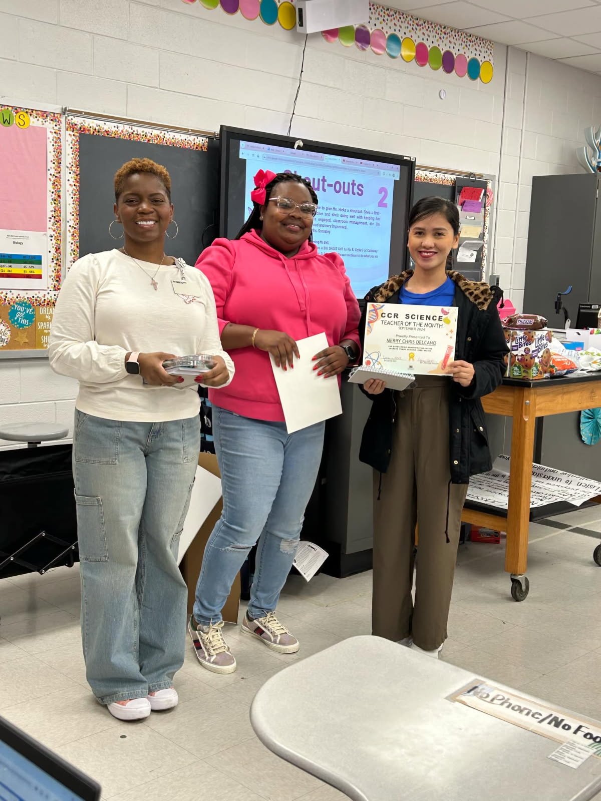 Delcano won the Science Teacher of the Month Award in September 2024. From left to right: Dr. Nzinga Harper, Denavia Bell (JPS science teacher coaches), Merry Delcano. JPS District.