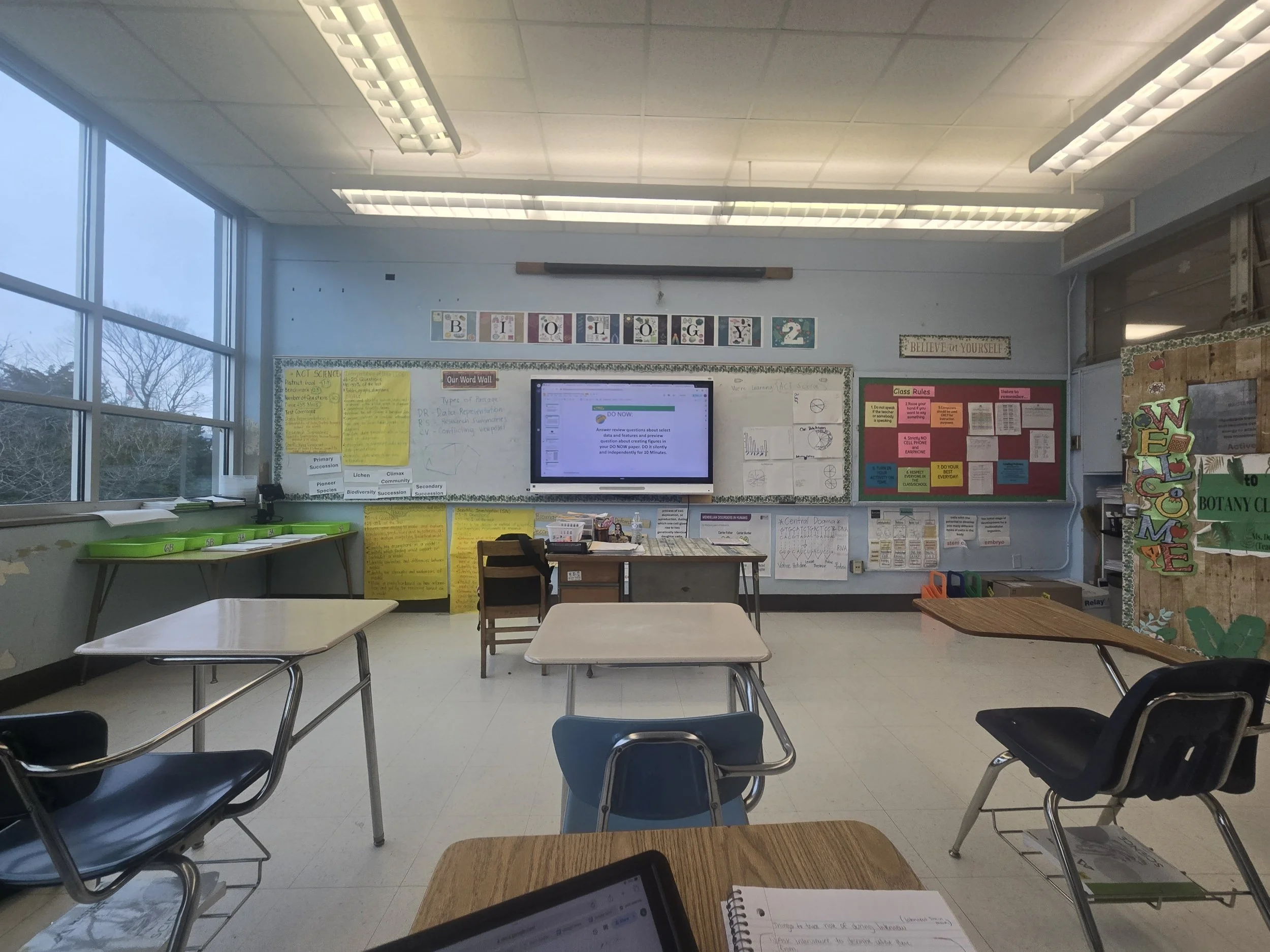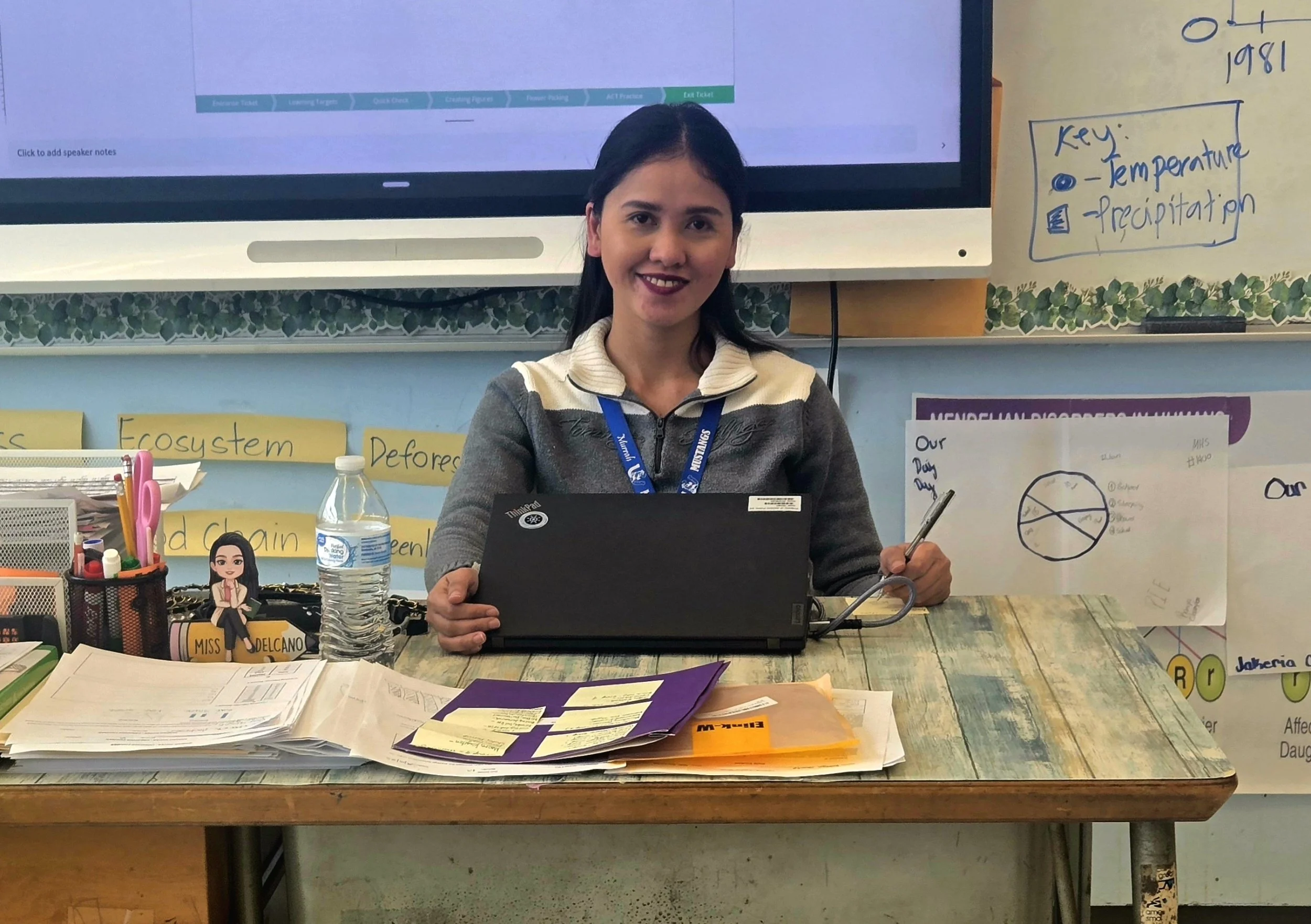 When stepping into Merry Delcano’s first-period Botany class, you are met with the sight of a big handwritten welcome sign on the door and the sound of her greeting you with a warm “Good morning.” This invites a wave of comfort to wash over the classroom's atmosphere. Toward the front of the room is where her desk sits, a custom-made nameplate and yet-to-be-graded worksheets atop it. Behind the desk is a wall adorned with students' artwork and a board showing today's agenda. Above that is a “Believe in Yourself” sign, giving comforting advice to the students who sometimes need the reminder.